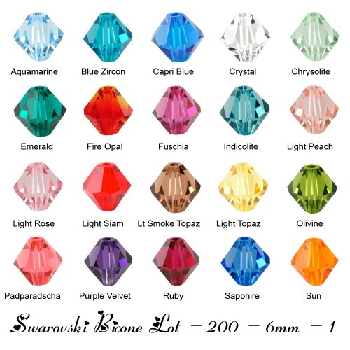 -Austrian Swarovski Crystal Beads -5301 BICONE 6mm Crystal Beads -What you will receive: +Quantity: 200 beads total. 10 beads of each color. +Size: 6mm. +Colors: Crystal, Sapphire, Capri Blue, Olivine, Lt Topaz, Emerald, Purple Velvet, Sun, Lt Peach, Indicolite, Indian Sapphire, Fuchisa, Chrysolite, Padparadscha, Ruby, Fire Opal, Lt Rose, Aquamarine, Blue Zircon, Lt Siam. (see color chart below for pictures. NOTE: The colors you will receive are listed in the description. It may be changed to similar color if it's out of stock) +Shape: Bicone.