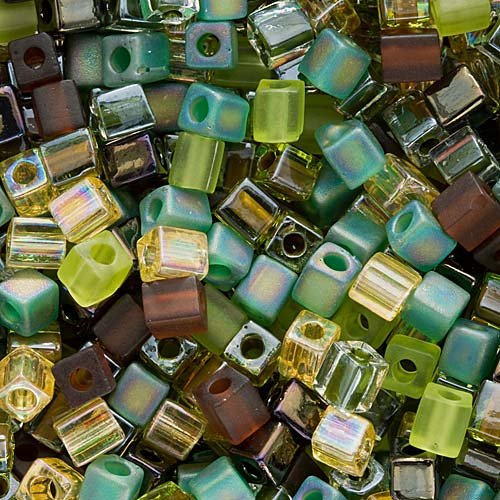 Miyuki 4mm Cube Beads. Color Mix "Earthtones". 10 Gram Tube / Approximately 100 Beads. Miyuki Cube Beads are prized for their precise shape and uniform color. The "Earthtones" color mix includes Brown, Amber, and Green colors with Matte, Crystal, AB, and Color Lined finishes. The 4mm Size actually has the following range of measurements: 3.8-4mm long, 3.4mm wide. Hole is approximately 1.3mm in diameter. When strung, there are 6.5 beads per inch. Packaged in a reusable tube, you will receive 10 grams of beads, approximately 100 beads total. Color: Earthtones Mix.